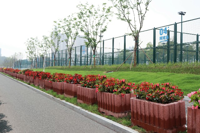 南艷湖全民健身中心的花箱隔離設(shè)施其箱內(nèi)主要種植繁星花、五色梅、海棠三種花卉