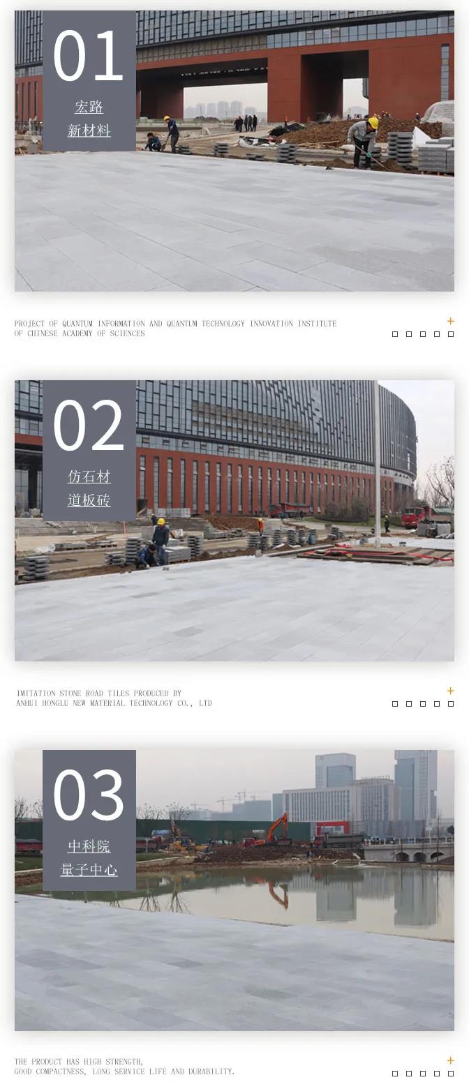 中科院量子信息與量子科技創(chuàng)新研究院,作為全省科技創(chuàng)新“一號工程”,是合肥綜合性國家科學中心的重要基石,建成后將服務(wù)于國家信息安全保障、計算能力提高等重大需求。宏路科技憑借優(yōu)異的產(chǎn)品質(zhì)量和完善的售后服務(wù)體系,獲得了施工方的高度認可和青睞,非常榮幸地參與到了這一重大項目的建設(shè)過程中,為項目建設(shè)提供優(yōu)質(zhì)的仿石材道板磚等產(chǎn)品。